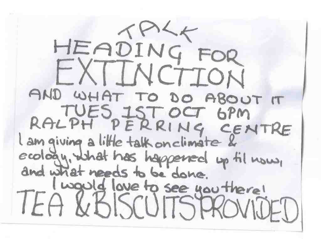 An invitation appeared on our notice boards recently. It looked to be from from an Extinction Rebel, asking us to join a talk in the Sir Ralph Perring Centre about ecology and the climate emergency. Free tea and biscuits were promised.