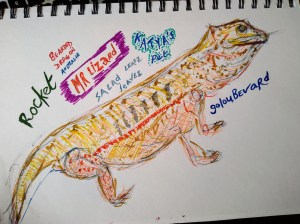 📌 At today’s Open Studio Zoom session, Kat brought along her pet, Mr Lizard, for us to draw. He is a He, she said. He is anally incontinent in front of a camera. He eats rocket. He is a Bearded Dragon, originally from Australia. And most surprising of all, he is about the size of a shoe, not one of the tiny things you see scampering around your terrace while on holiday.