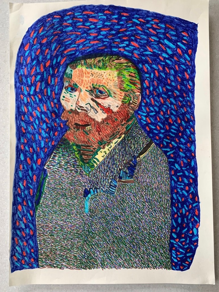 In one of our Open Studio sessions not long ago, we looked at the work of Vincent van Gogh. As our attention was being steered towards the richness of colour in some flowers, Sam spotted something else. She worked at her vision for a week then emailed me a photo of her ‘Van Gogh’.