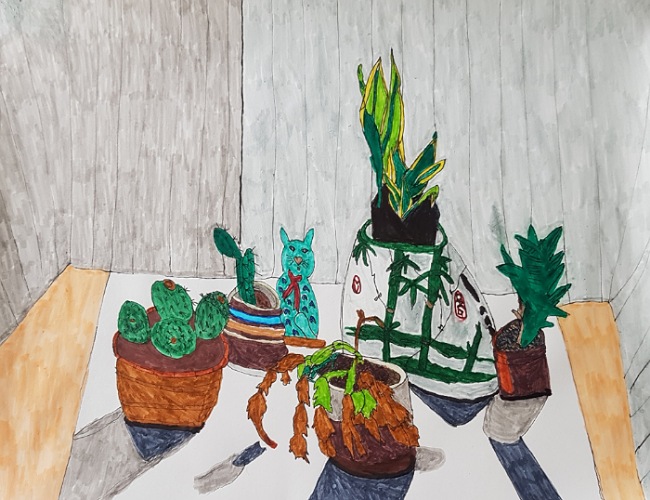 # Sam sent her finished picture from Brian’s recent Zoom Studio session on his collection of cacti and succulents.