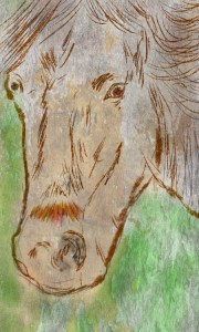 # On the walk to Headway I listened to Elvis Costello’s King of America album and later me, Chris, Stuart and Bryn rehearsed the track Indoor Fireworks. The musicians in the quartet opted to do it in the key of D. I tapped my feet, mouthed the lyrics and did as little as possible. Later in the studio I did a picture of a horse from one of Derrick’s photographs.