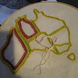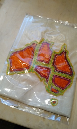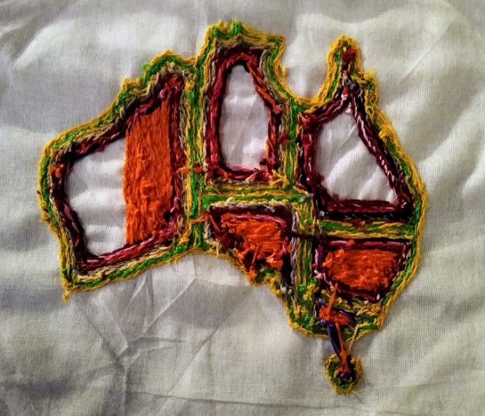 The mappy stitchwork projects are a great way to travel in your head. In this case, lots of memories from our big trip to Australia in 1997 emerged, like that time at that camping spot just outside Coober Pedy when my wife tried to eat porridge through the fly net that was covering her face.