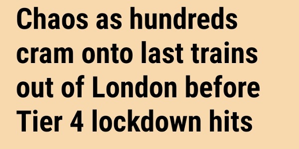 SUNDAY 20 The radio phone-ins are full of unhappy people bewildered that three days before the PM introduced us to his “crocodile tiers” he was saying the 5-day reprieve for Christmas was an immovable feast. People feel punished by his obvious weakness of leadership (“public fury over last-gasp change of mind”). The media is happy to report their discontent.