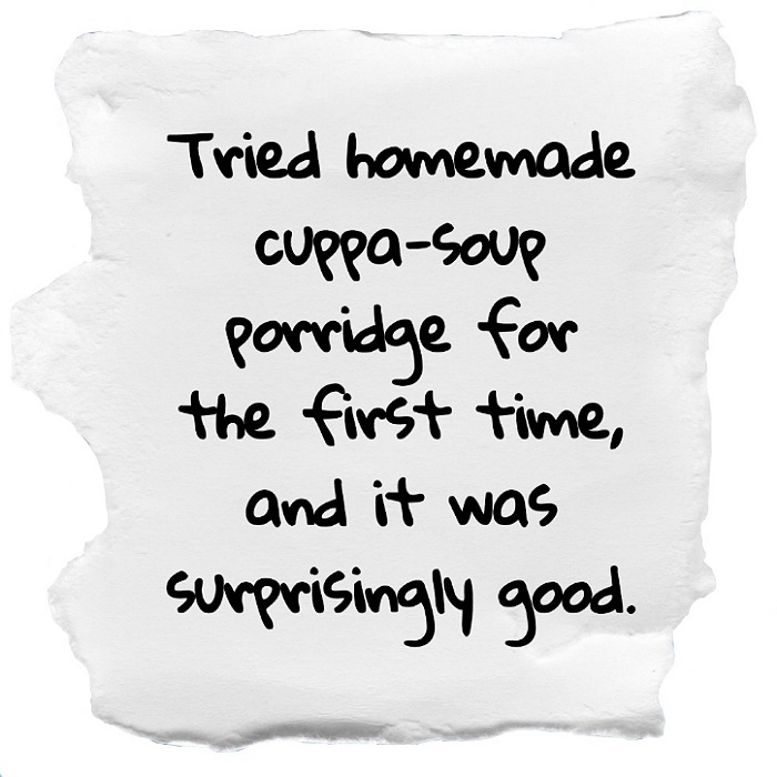 You can buy it ready made, but I simply add porridge oats to instant packet vegetable soup and stir furiously.