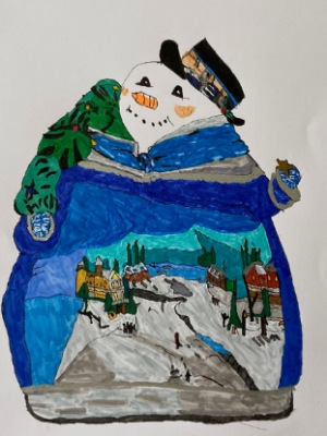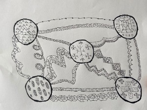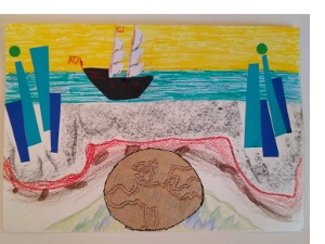 📌 In art class today we played a sort of pass-the-parcel postcard game. One person starts the artwork, which is then passed to another person, who has already passed their “startwork” to a third person. At each stage new additions are added to the image and the artwork circulates and changes at each point at which it reaches the next artist. I started my “postcard” with a yellow nuclear sky above a supposedly radioactive blue sea.