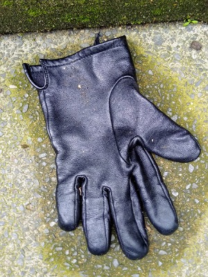 📌 A large single black leather glove discarded and lying ominously on stained concrete. It seems to be saying something. A detective would note that it is a left-hand glove. Sinister, or what?
