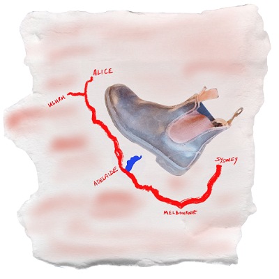 📌 In the USA there’s a day for everything and today it was Old Brown Shoe Day. This was therefore our task in today’s art class. I chose an old Blundstone boot combined with a sketched map of our road-trip route in Australia, 1997.