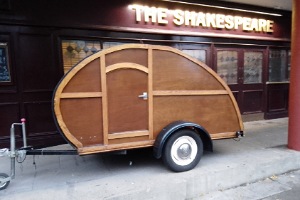 📌 Spotted a smart trailer, which doubles as a mobile bar, parked outside our local pub. It’s shape is reminiscent of a Morris Minor crossed with a Volkswagen Beetle.