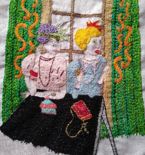 📌 Progress on the stitchwork version of Sean’s discarded sketch is slow but enjoyable. It has become a new image in the process. The two gazing 1920s women at the café table have become my eccentric friends.