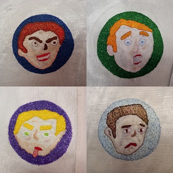 📌 The fifth in a series of six stitchwork patches depicting human emotions is bouncing along towards its end. Then comes the arguments I have with myself as to what colours are appropriate for the final patch (Happiness). This is when I study the collection so far and dither.