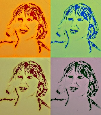 📌 In Art Class our theme for 2 weeks is Repetition. I am trying to make a crazy 3d rotating picture, which is half completed. In the meantime I played around with repetition and pattern using some cheap postcards I got in an Amsterdam photo gallery last weekend. I got 10 identical postcards of a sultry young woman staring defiantly at the viewer (€2.50 for 10). I will experiment more with this image, but made some roughs to be going on with.