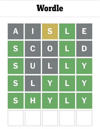 📌 Every day my wife and I compete at Wordle and compare answers at the end. Today, we both scored 5 in exactly the same sequence of words.