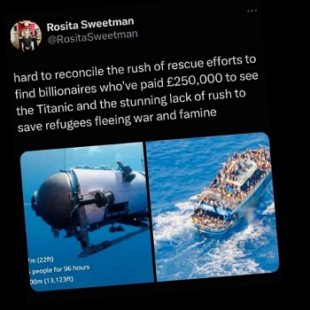 📌 The missing submarine tourist vessel Titan (it snoops around the wreckage of the Titanic) is reported to have “only” 96 hours of oxygen left in its tank. If by some miracle the rich people on board emerge from the ordeal in good health, I hope they reimburse the US and Canadian search parties for all the trouble their morbid curiosity has caused. Of course, if they don’t, the previous sounds callous and heartless.