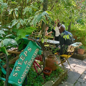 📌 Lunch at Burgh House in leafy Hampstead, where me and Cecil will be sharing an exhibition in a few weeks. We posed for some pictures and charmed the nice but very dim “Hampstead Ladies”, to whom we must have looked like strange zoological specimens as we dined in the garden on our self-made cheese and pickle sandwiches. Sophie, the exhibition’s curator, bought us a cup of tea and a Burgh House Scone with clotted cream and pulped raspberries. It was awesome. On the way back to the station me and Ambar were held captive in Flask Walk by a jolly plasterer who told us how he uses stencils to decorate plane walls with hanging fruit and assorted foliage.