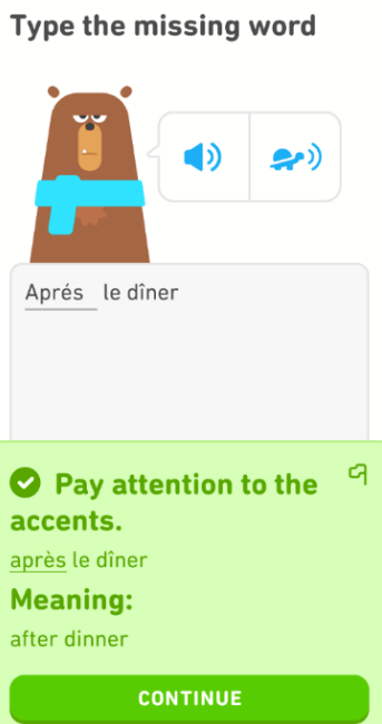 MONDAY 4 Gender is my big downfall in French. I just don’t know if a pizza is a le or a la. My other big crime on Duolingo is accents. Who’d have guessed that aprés is actually après.