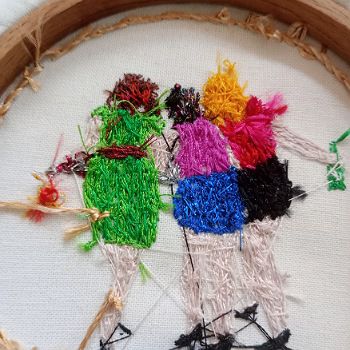 📌 I have a daily “Task” message that reminds me that “the middle hen’s shoes are too big”. This refers to the image above of the three carousing women. The sketch from which this stitchwork comes needs correcting, hence the daily nudge to get on with the job. But my wife has a different way of seeing it. She says the “middle hen” has in fact keeled over on her high heels and the feet we are looking at are not too big but twisted by inebriation.