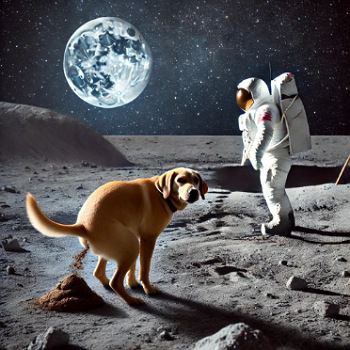 📌 Several years ago for fun I made a digital montage based on the idea that when man first landed on the moon, one of the things he discovered was a dog having a poo. Today I asked ChatGPT to create that image for me, and it turned out to be remarkably similar to my own pre-AI creation, though not as good, I believe. My astronaut (tiny, top left in image) staggers over a big rock to see in the distance a Labrador in full squeeze. ChatGPT’s image crudely places the astronaut and the dog (a Labrador, even though that wasn’t specified in the description) next to one other. My Labrador is not scaled well, but that is a peanuts error compared with ChatGPT’s lousy composition.
