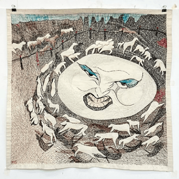 FRIDAY 13 At Headway yesterday both Nat and Alex returned from a visit to a drawing exhibition with a recommendation. It was a stitchwork by an artist called Myrtle Glanville of one of her own pastel drawings, the poetically titled Run! Run! When the sun goes down will be done paint done. The piece used the kinds of stitches I am now experimenting with, long, random, ragged. I just used a very ragged one on the latest in the Wonky series. The nose got damaged so I filled it up with far too much scraggy pink thread to hide the blemish.