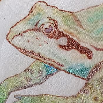 My own task was to carry on with the stitchwork of a frog, which I’d lost interest in but was won back when I started on the face, which seemed to have character. I have provisionally named this piece The Miserable Frog