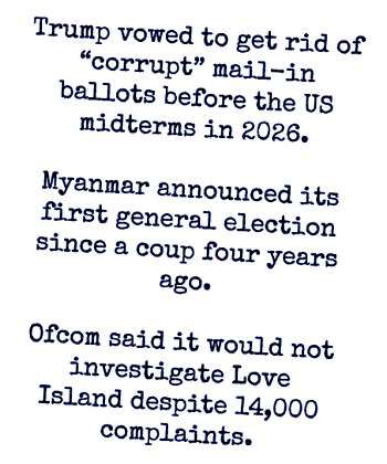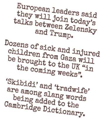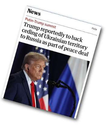 SUNDAY 17 Lawrence Freedman reckons something useful did actually come of the charade summit in Alaska in which Trump and Putin pretended to talk to each other, each claiming the conversation had a positive outcome. Freedman noticed two details: that the US broadly aligned with Ukraine on territorial claims, and that the talking is now trained on the endgame.