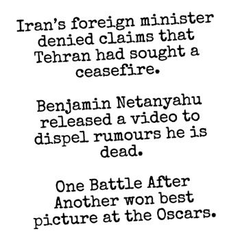 SUNDAY 15 America’s newest war in the Gulf has an impact way beyond the price of oil. According to a New Statesman article, Iran’s control of the Strait of Hormuz gives it the power to screw up your life. If Trump’s war continues indefinitely, products you treasure (eg, shampoo, shower gel, chewing gum and even salt & vinegar crisps) will soon either disappear from the market or become so expensive you won’t be able to afford them. I always preferred cheese & onion anyway.